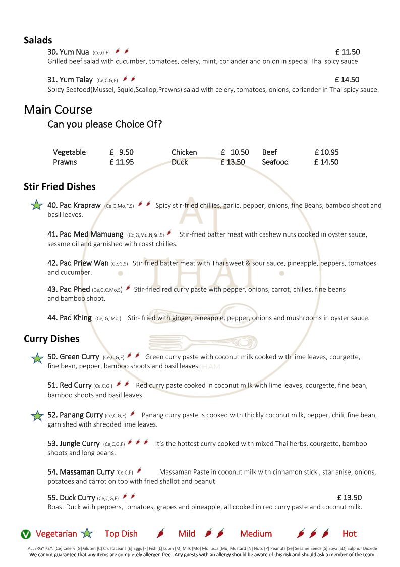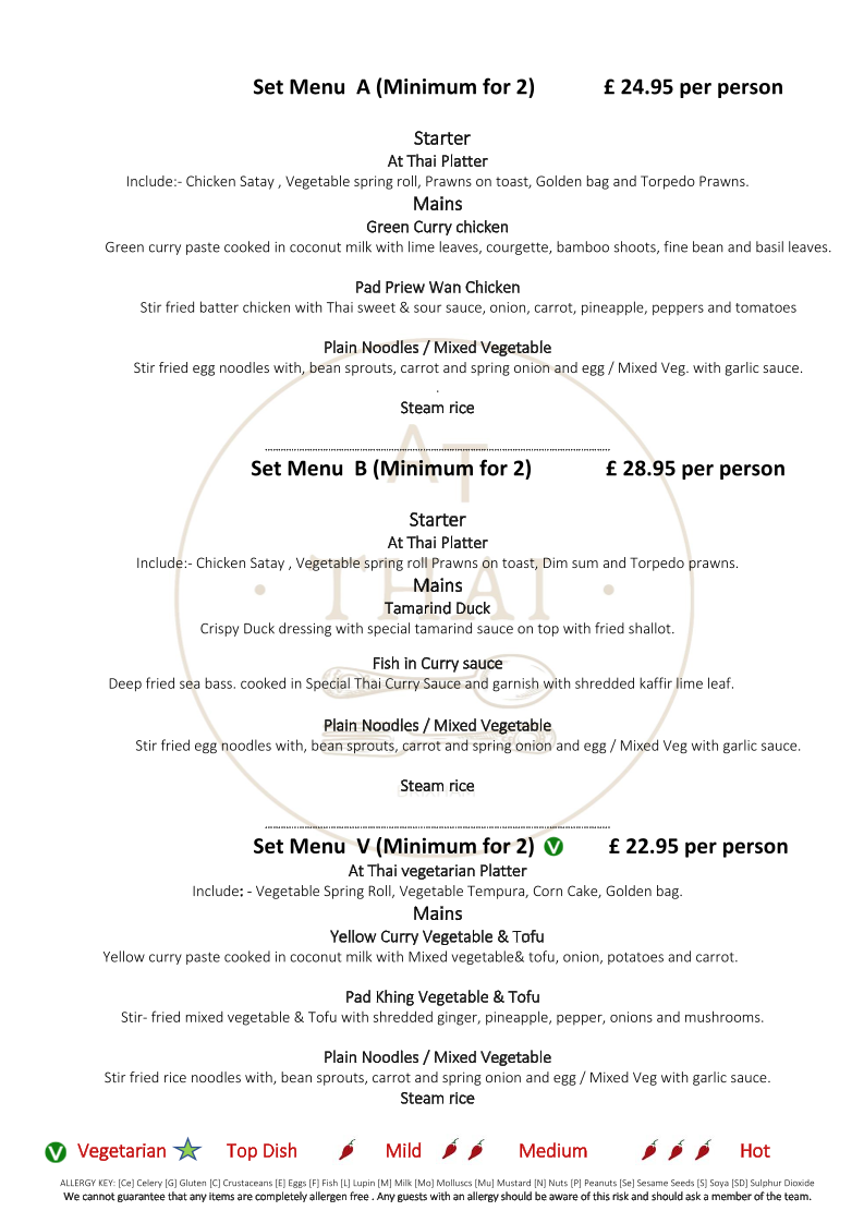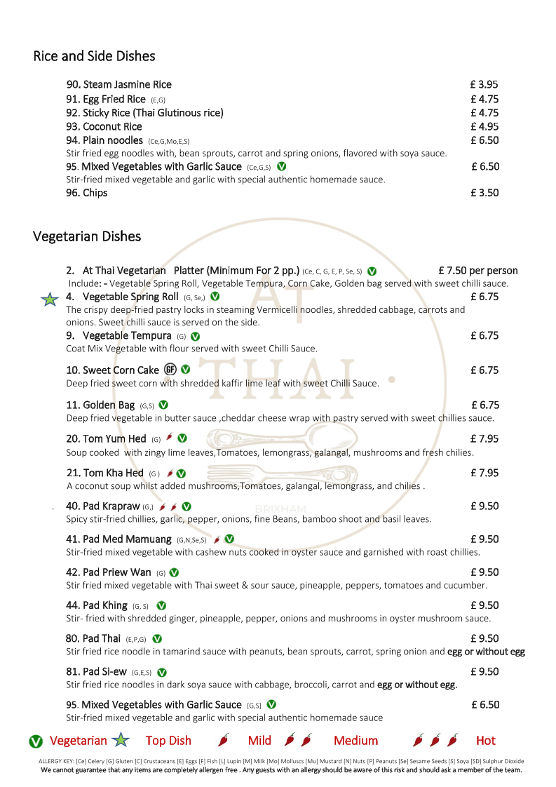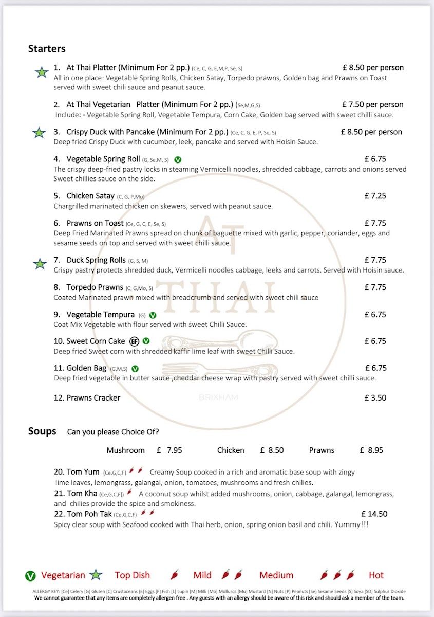 You’ll find signature items like Pad Thai, Massaman Curry, and Satay Chicken alongside lighter options such as Vegetable Tempura and the At Thai Vegetarian Platter. The inclusion of dishes like Salt & Pepper Soft Shell Crab and Peking Duck Spring Rolls adds a touch of variety that complements the overall menu without overwhelming it.